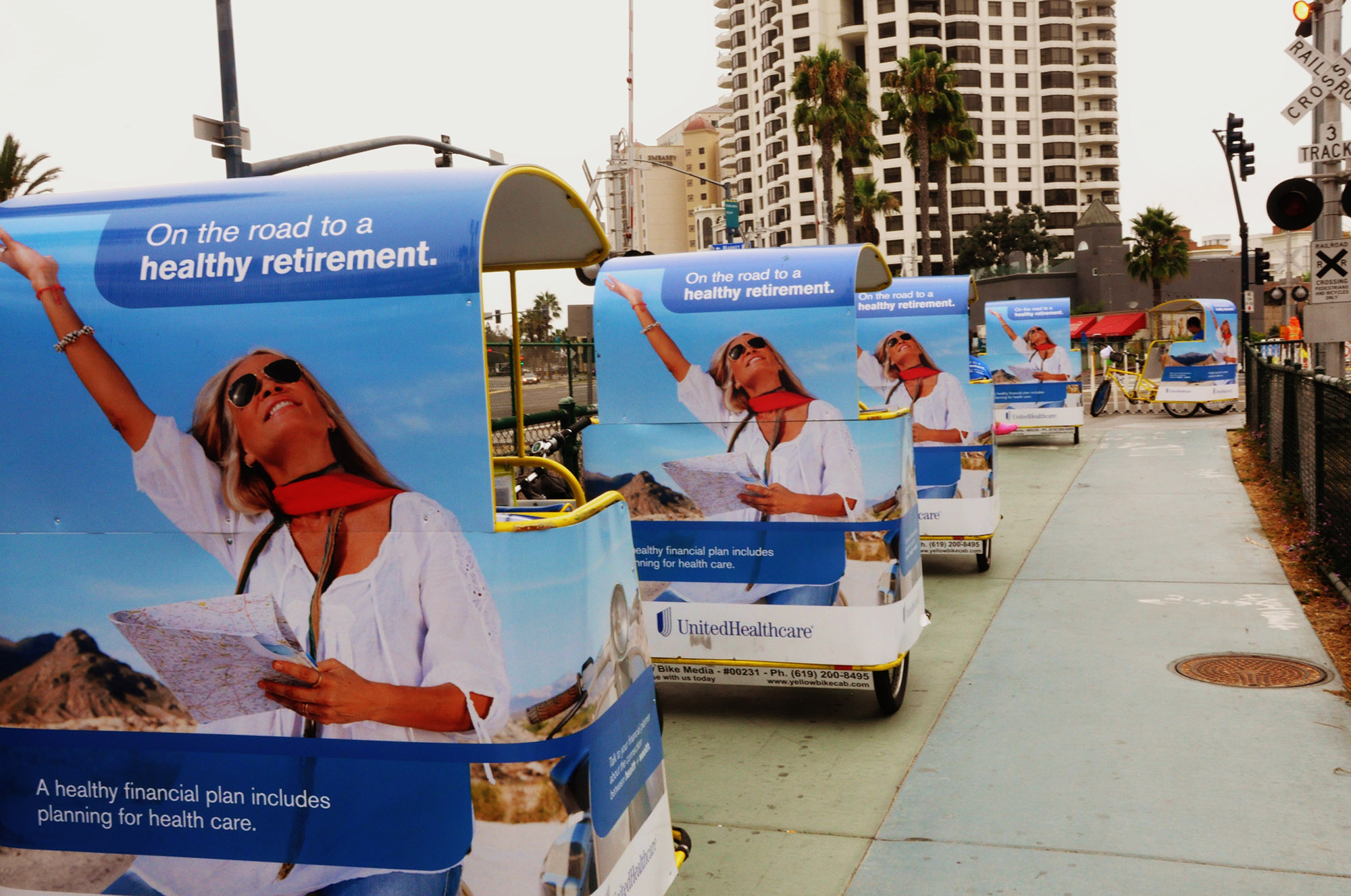 7 to 9 sheet displayed fully wrapped unique pedicabs which are specifically designed to accommodate your advertisement. Full wrap covers the rear side of the cab body including side panels, front panels, and right & left side of the front wheel.